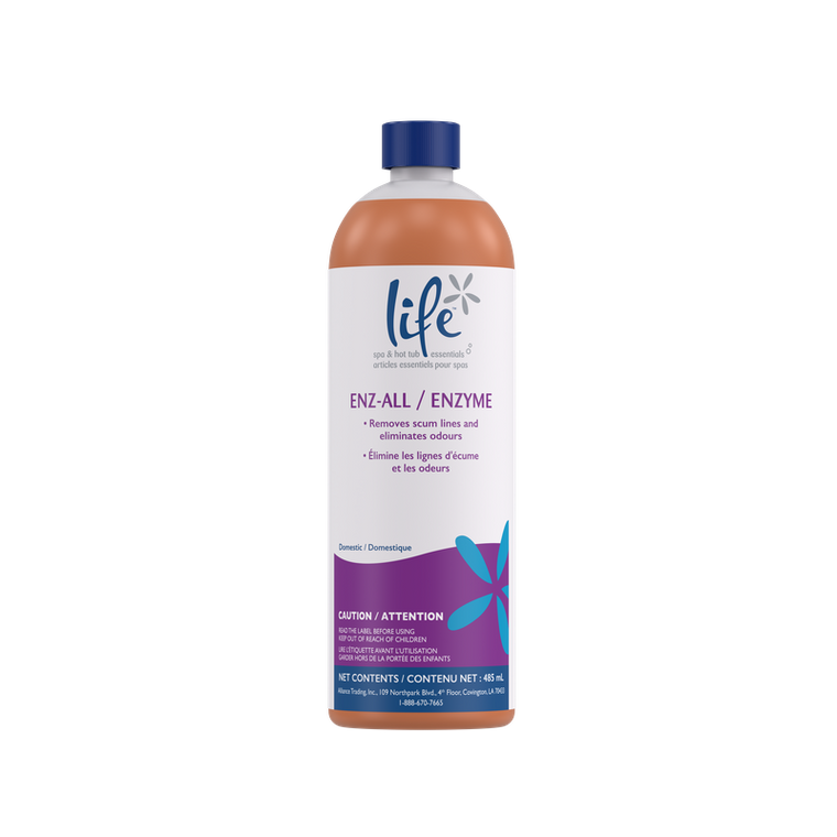 Hot Tub Enzyme Enz-All is a natural enzyme cleaner that eliminates oils, lotions, and organics that cause unsightly scum and odours in spa water. Reduces the maintenance of filters and spa surfaces. Compatible with Bromine, Chlorine, Ozone, and Peroxide-based sanitizers. This product is biodegradable.