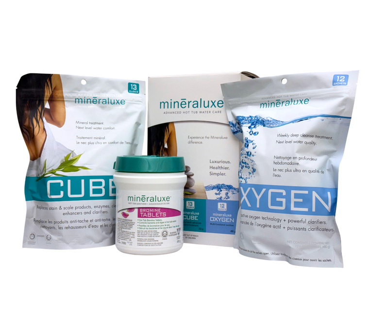 Mineraluxe 3 Month Bromine System is specifically designed for hot tubs to give you a simplified, easy system for maintaining your hot tub water. Based on Bromine sanitization and the main product, " Cube " which replaces other chemicals required for keeping your hot tub water clear. Eliminates the need for scale inhibitors, water clarifiers, and enzymes. Actively repels biofilm that can build up on the hot tub surface and pipes.